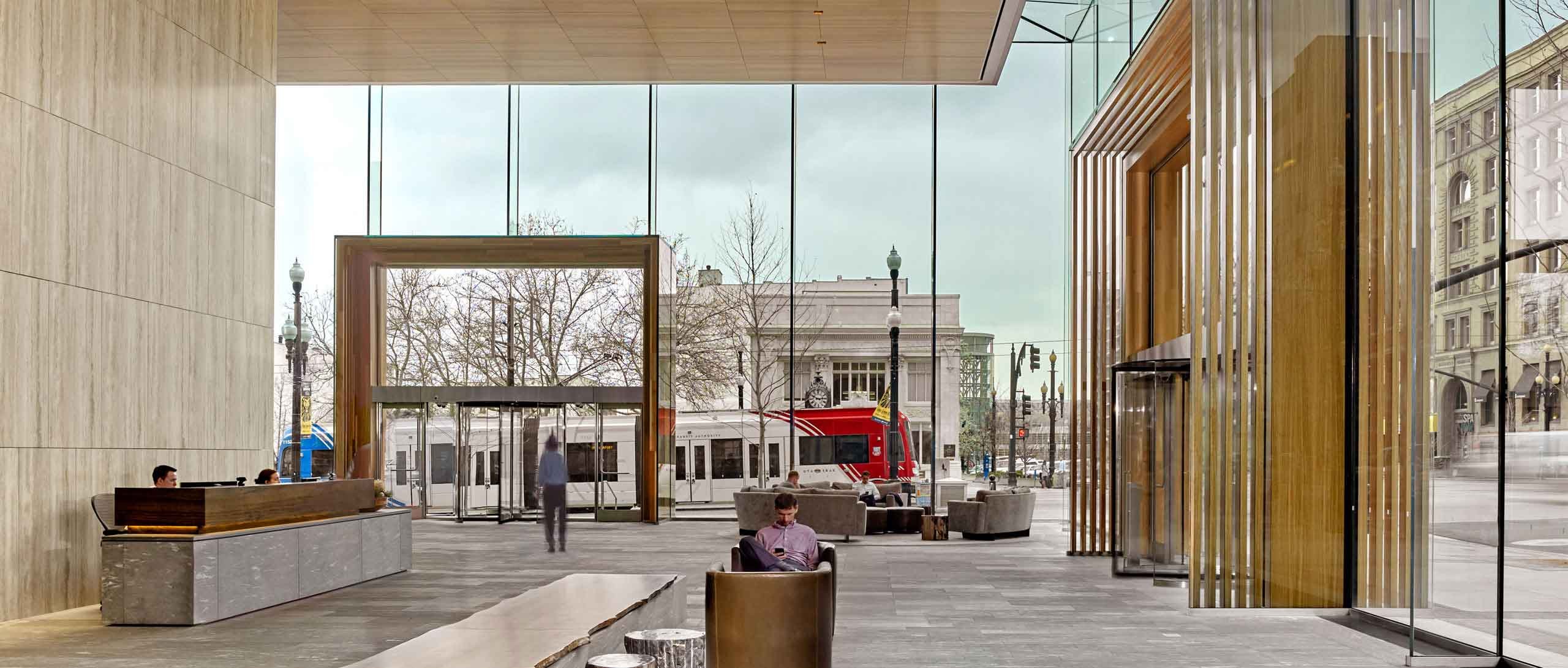 111 Main est l’ajout le plus récent à la Skyline de Salt Lake City. L’édifice a été conçu sans colonne sur 24 étages grâce à des éléments de tension suspendus depuis le toit. La gaine élancée en retrait du périmètre de la tour permet d’obtenir un vaste hall d’entrée haut de plus de 12 mètres.