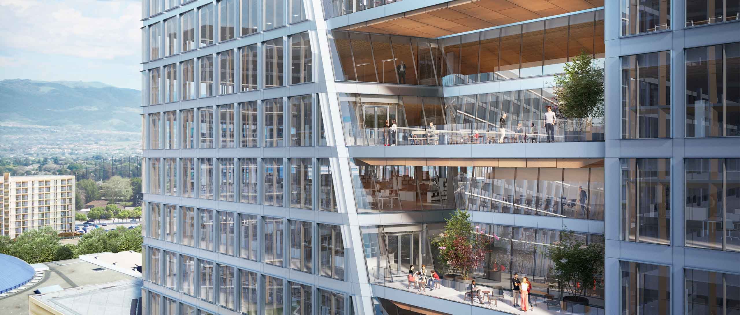 Conception de la façade d’une tour de bureaux portée sur la technologie qui apporte l’énergie et l’identité de la Silicon Valley au centre-ville de San Jose.