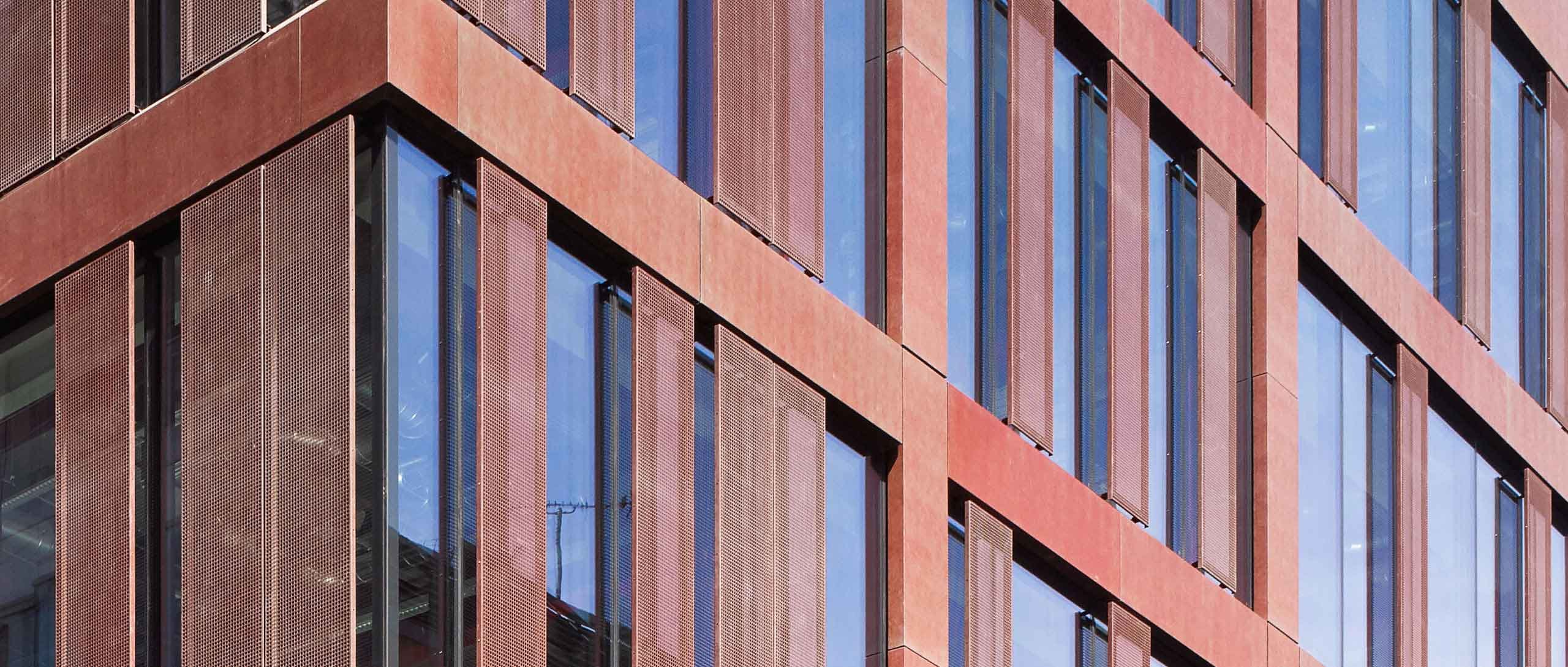 La façade est composée de shadow box périphériques en bronze et de brise-soleils perforés disposés sur les élévations du projet selon leur exposition au soleil.