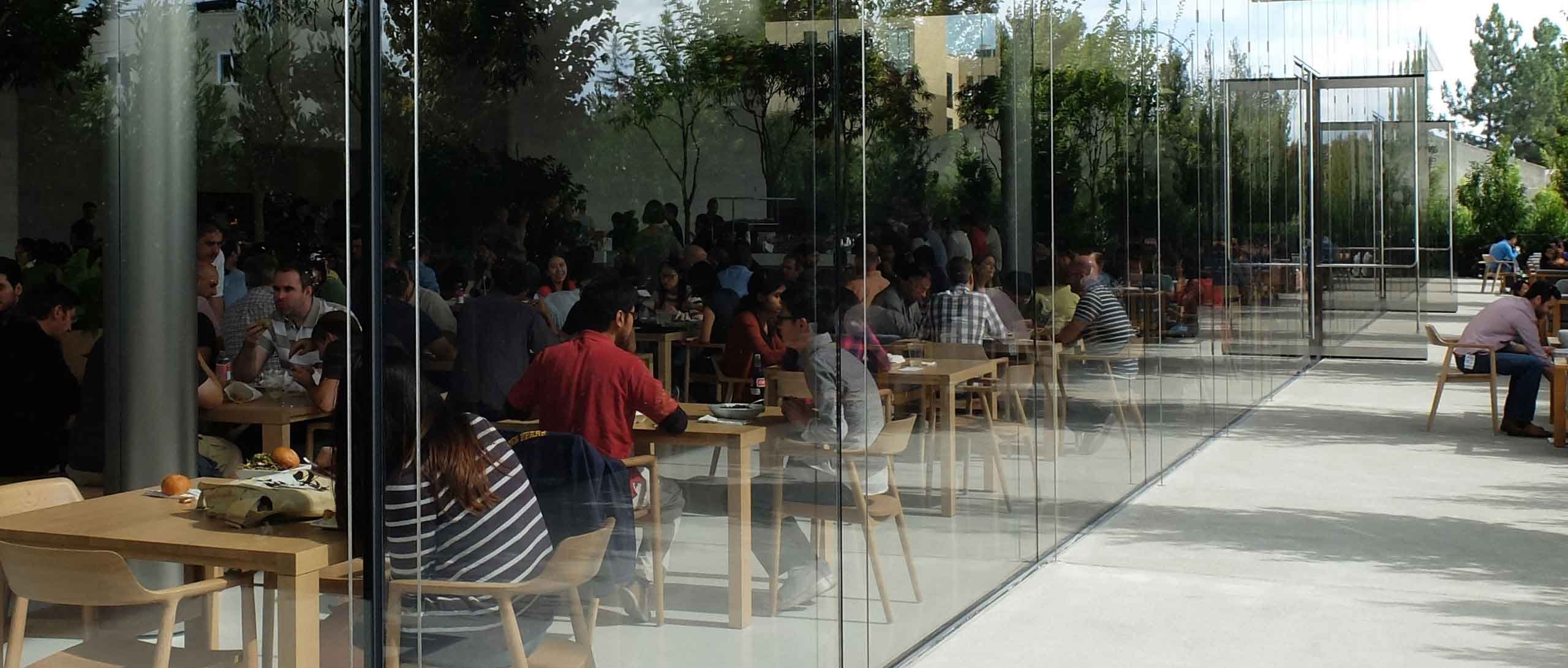 Ouvert en 2014, ce nouveau café d’entreprise est un volume unique, composé de murs vitrés sans cadre de 7,5 m de haut sur trois côtés. Ces murs intègrent des stores extérieurs et des revêtements de verre sélectionnés pour maximiser la lumière entrante tout en contrôlant le gain de chaleur. Le vitrage est conçu et détaillé pour s’adapter aux déplacements sismiques de la structure du toit jusqu’à 120 mm dans toutes les directions.