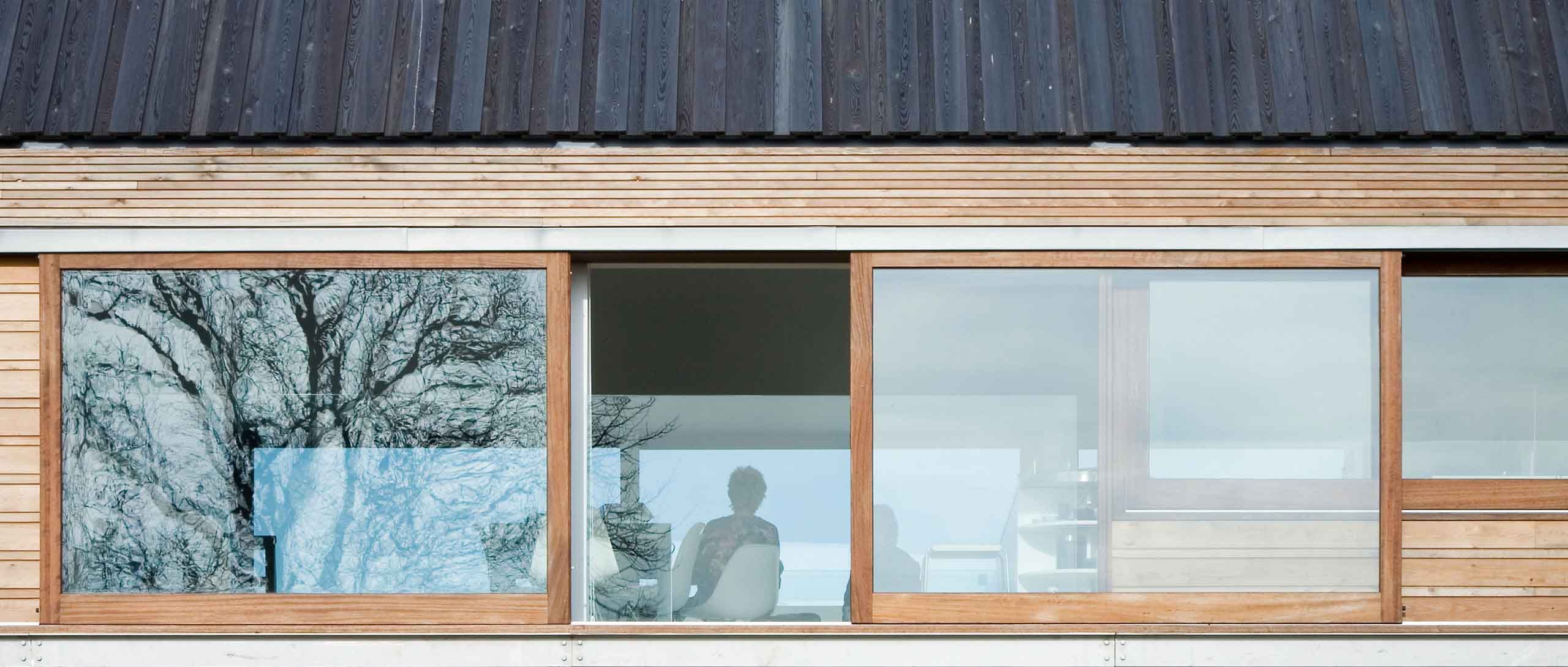 À chaque pignon de la maison de cinq chambres à coucher, l’on trouve un arc de miroir qui définit la forme du toit incurvé. Les principaux espaces de vie et la chambre principale sont situés à l’étage ; les fenêtres s’y étendent sur toute la longueur du bâtiment et procurent une très belle vue sur la campagne environnante.