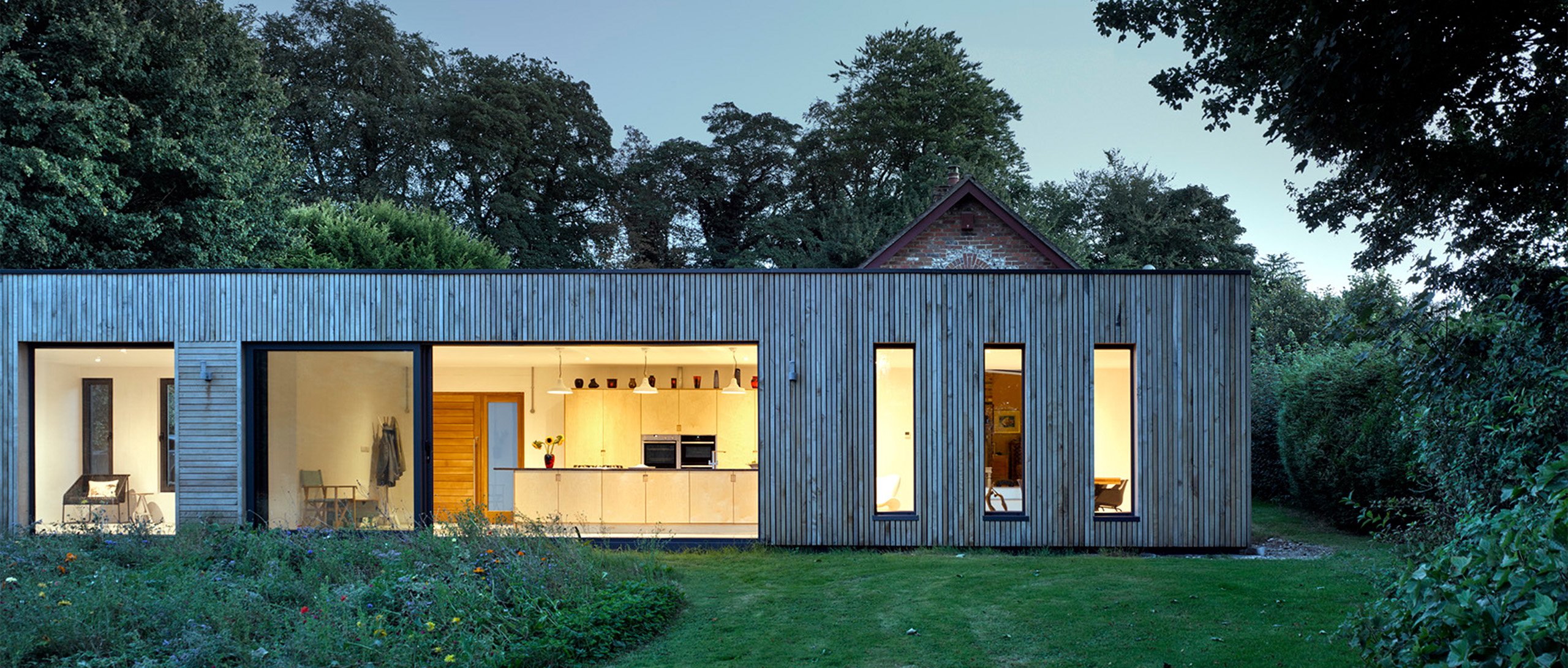 Extension moderne d’une maison de campagne du 18ème siècle, avec superstructure en bois lamellé-collé en cinq jours seulement.