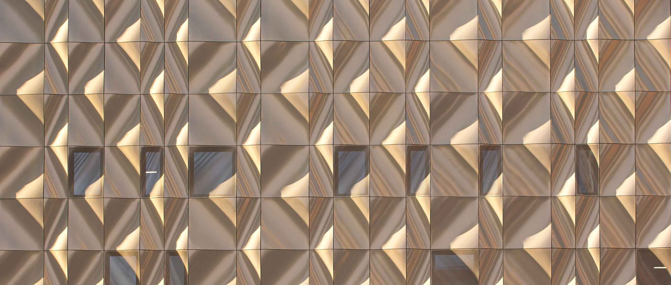Pavillon de cinq étages composé d’une façade complexe et ondulante, conçue pour relever les défis logistiques posés par une construction sur un chantier situé au-dessus de l’eau.
