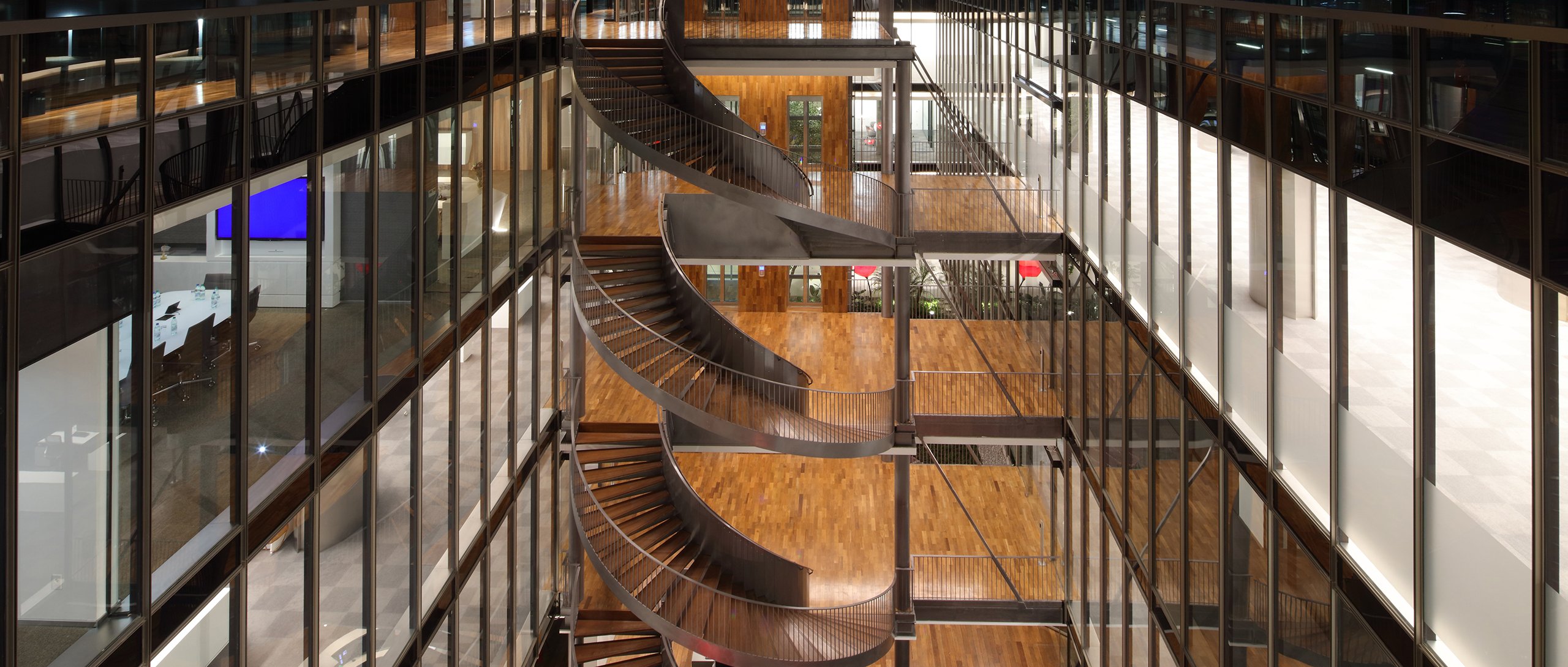 Escalier en colimaçon sur mesure et système de toit voûté en verre pour le siège de Trafigura en Amérique du Sud.