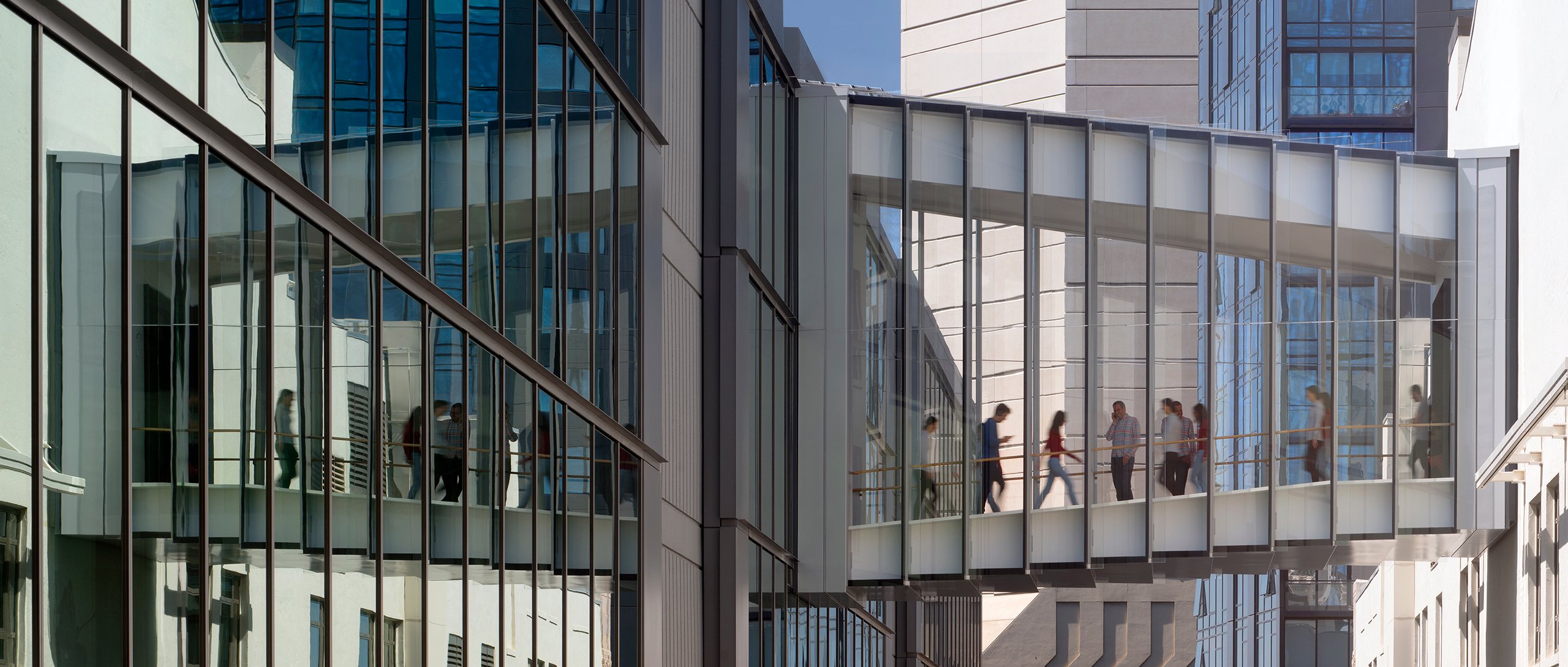 Passerelle avec une façade tout en verre à plumes reliant les deux bâtiments du siège social de Twitter à 100 pieds au-dessus d’une rue de San Francisco.