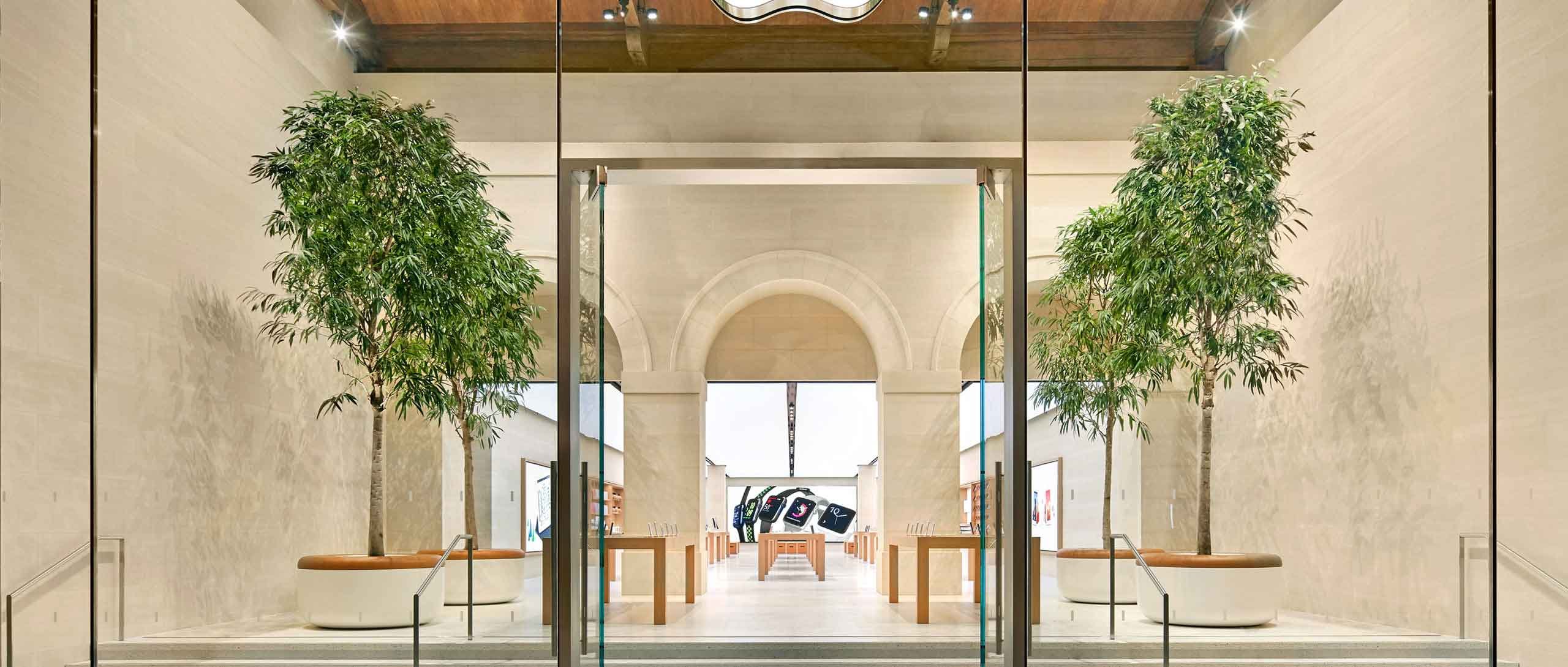 Glazed facade for a new Paris Apple store, located within a historic public market. The design accommodates existing timber beams, which pierce through the glass.