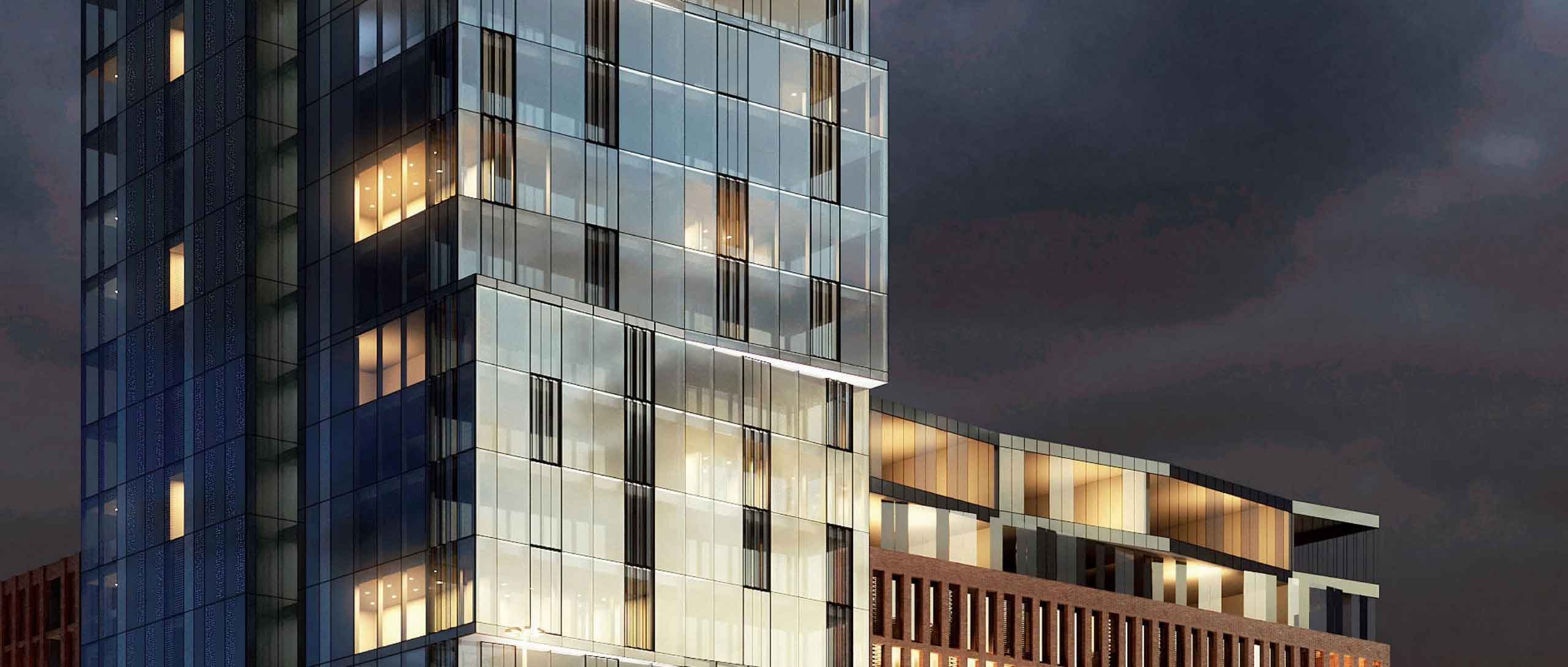 Building two comprises an 11-storey linear block and a 23-storey tower set within it. The building features full height facade components and a material palette of reconstituted stone mullions that reference the sandstone tones and textures characteristic of many of Manchester’s historical facades. Recessed within this grid are full height glazing and bronze-coloured metal screens. These screens conceal duct work above windows and guard glazed opening doors.
