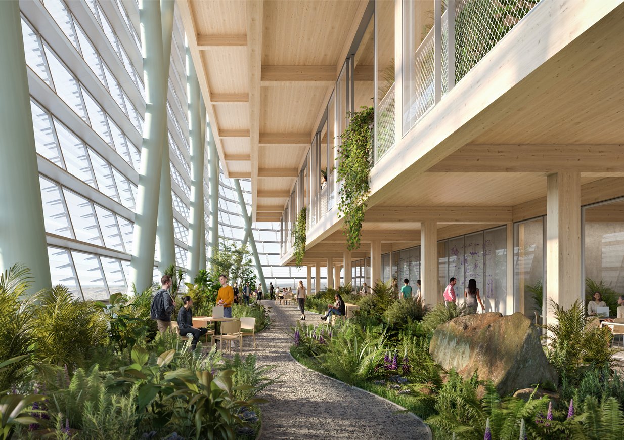 The groundbreaking design of timber, with a glass and steel facade will include a mix of outdoor and indoor spaces and will use an energy-efficient approach that features natural ventilation and large planted terraces giving access to nature. The building is leading edge in its application of Mass Timber Construction (MTC).