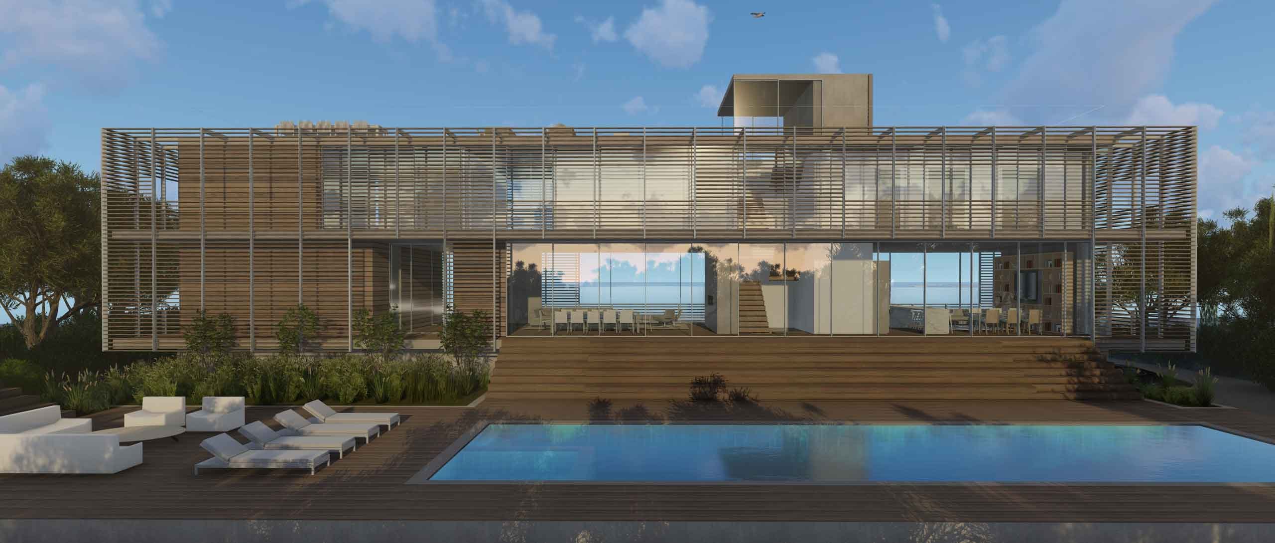 Eckersley O’Callaghan has provided full structural design for the house. The building features balconies running around its perimeter at the ground floor and first floor levels. A louvered rain screen system on
