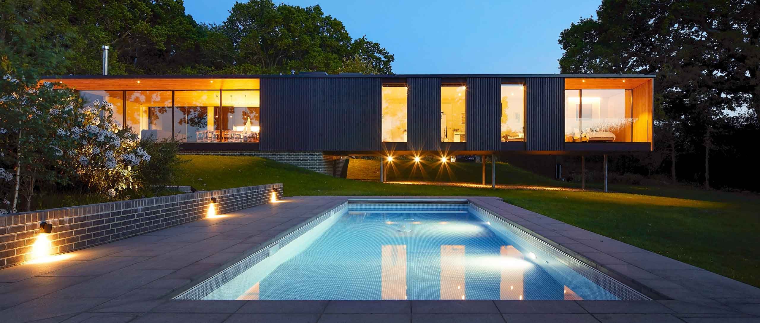 The topography varies considerably across the site, so half of the house has been elevated on slender external columns. Designed to reduce construction time and costs, the structural system consists of a primary steel frame that forms a raised ground floor ‘strong deck’, supporting a series of loadbearing timber stud walls. The ground floor and roof infill are all built with timber joists. Another level of steelwork was required on the largely glazed north facade to achieve 10 metres of column-free windows that give access to a level terrace and swimming pool.