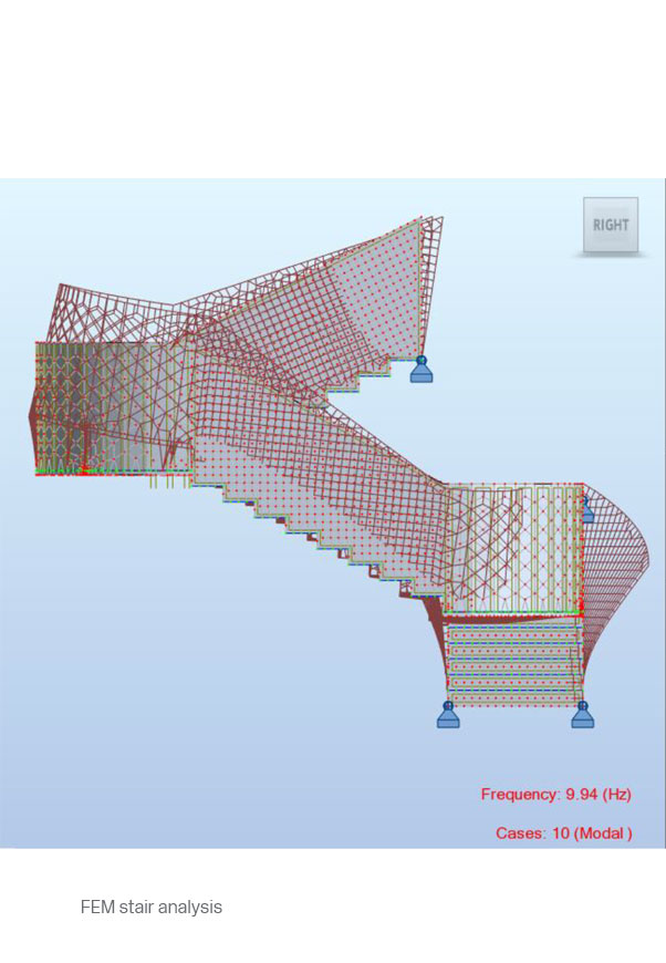 Seven cantilevering steel-and-glass staircases act as focal points within the building, each designed according to its individual situation. The staircases act as unifying architectural details within the structure.