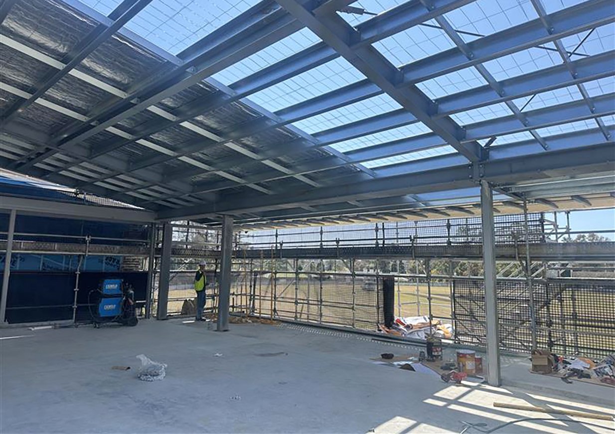 In addition, to achieve the expansive internal spans required for the pavilion hall on the first floor whilst maintaining uninterrupted views of the playing field, a steel portal frame structure was implemented. Designed to integrate seamlessly with the external cladding, screen elements, and folding roof form, the distinctive edge profiles define the pavilion’s modern aesthetic.