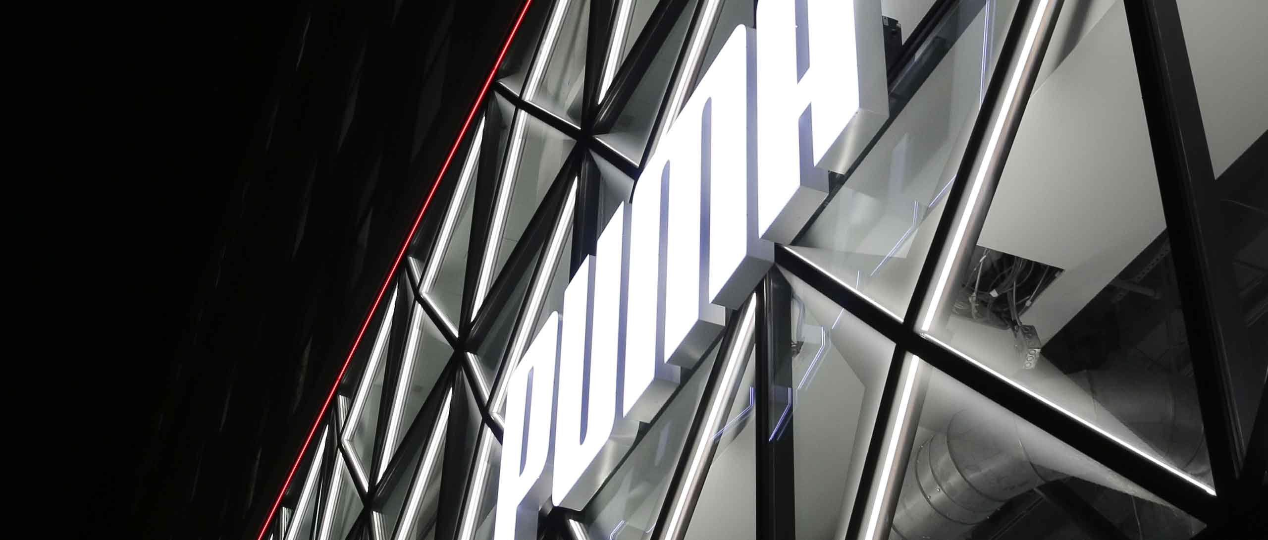 Puma used the upper portion of the facade to express its brand identity where it is divided into approximately eight-ft six-in squares further subdivided into four insulated glazing units replicating the star pattern printed on the soles of its classic Puma Suede sneakers. Tridimensionality of the motif is achieved by pushing the central point of each star outward. Ceramic frit is silkscreened onto the edges of the triangular glass panels and backlit with LED light strips integrated into the support frames to accentuate the illusion of faceted stars.