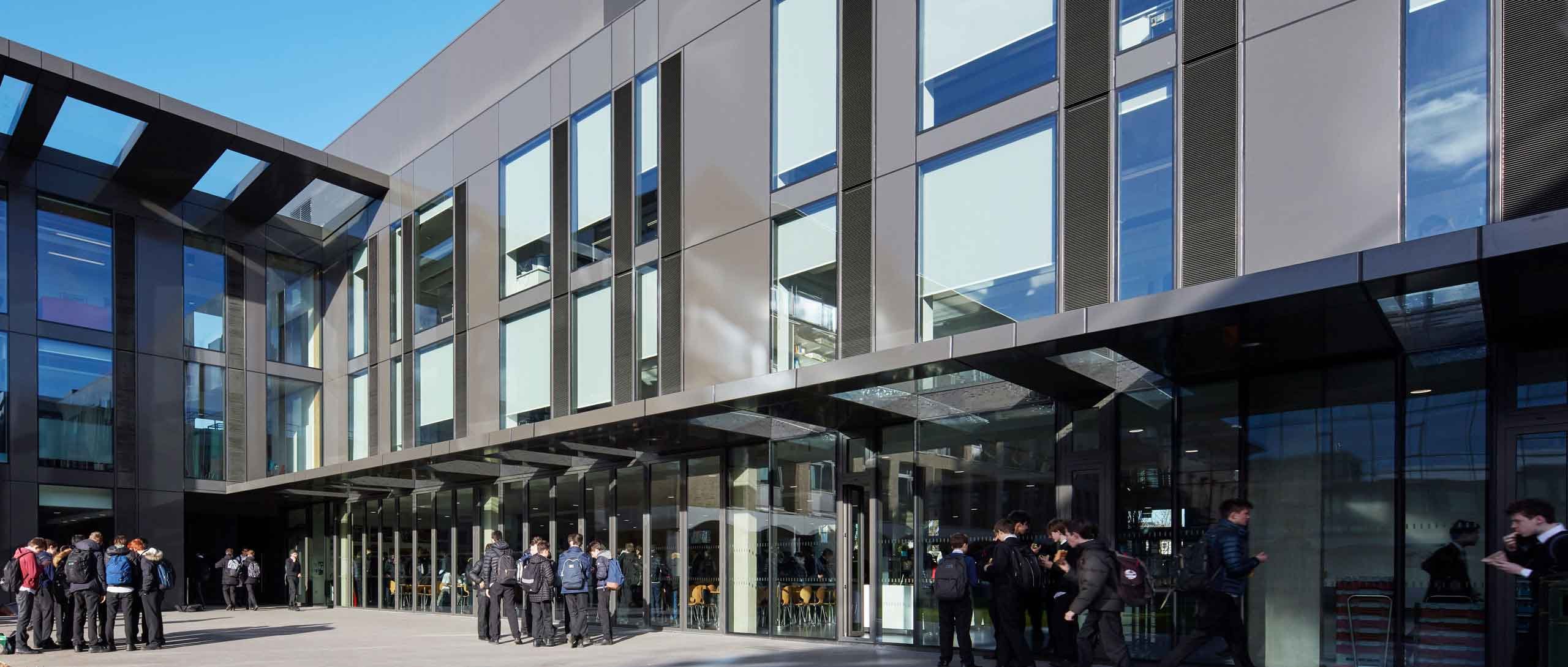 New school teaching block, featuring two distinct facade compositions that contribute to the building’s high energy efficiency.