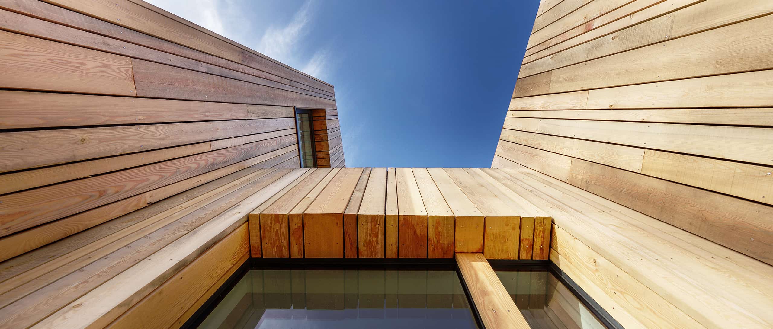 The lightweight timber frame superstructure is supported off the steelwork. Isolated steel elements exist in the superstructure to help create large open plan spaces and asymmetric roof profiles. This also provides framing for the sliding doors to give dramatic views over the clifftops and the sea beyond.